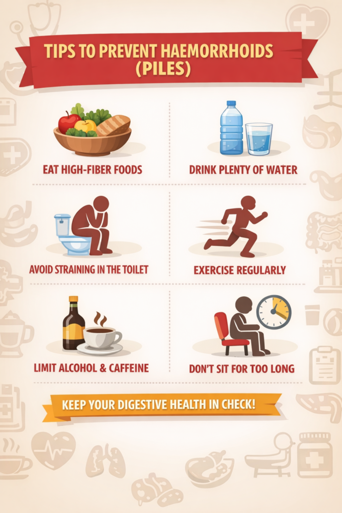 Lifestyle habits also matter. Regular physical activity supports digestion and helps prevent constipation and weight gain. Avoiding long periods of sitting, practising healthy bathroom habits, and not straining during bowel movements can further lower the risk.
