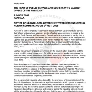 By Eman yonah oruk In a bold and unprecedented move, the Uganda Local Government Workers Union (ULGWU) has officially declared a nationwide industrial action set to begin at midnight on Wednesday, 1 October 2025. The announcement, delivered via a formal…