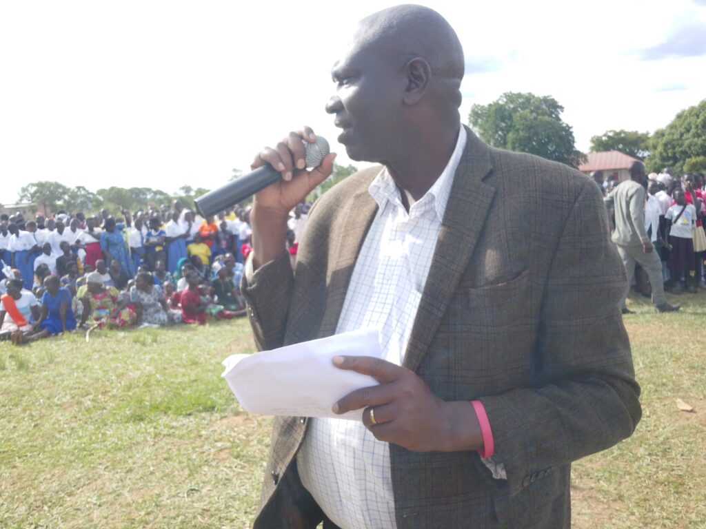 Christ Ongom, Vice Chairperson of Oyam District, speaking on behalf of the District Chairman, highlighted the theme of the celebration: Scaling up Investment to Accelerate Access to Justice for all Women and Girls in Uganda. He announced that the district is constructing a four-stance latrine at Abok Primary School to support girls’ education and improve sanitation.