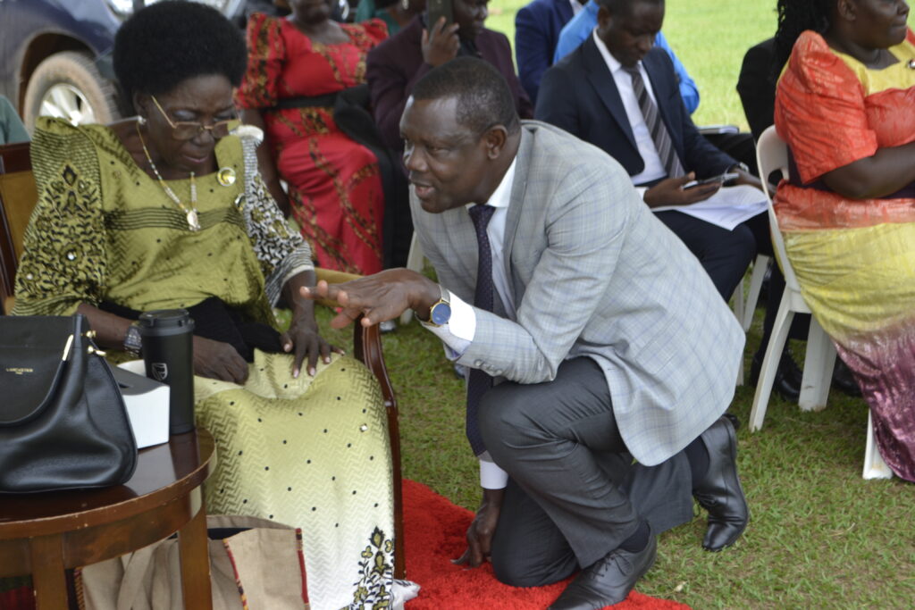 Kamuli CAO Ben Marley kneels as he is tasked to follow up HOLD Uganda Model on Real Father Model during the district Women’s Day celebrations at Bulopa SS